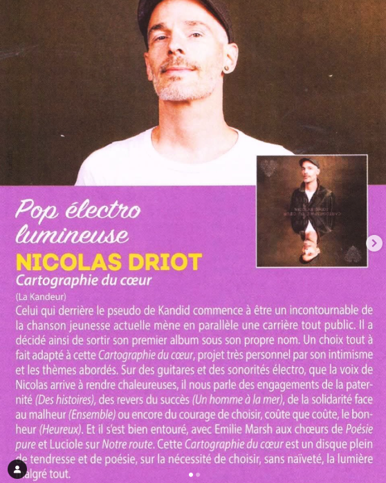 Né à la musique sous le nom de Kandid, il redevient avec « Cartographie du Cœur » Nicolas Driot et enlève ainsi tous les masques possibles pour être au plus proche de ses émotions qui ressemblent aux nôtres.